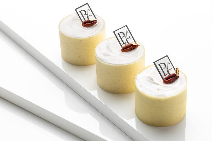 Croustillant noix de pécan , biscuit moelleux amande , crémeux noix de pécan , crème légère vanille bourbon de Madagascar