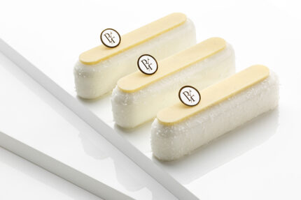 Croustillant coco, biscuit moelleux amande, crémeux passion, crème légère vanille.