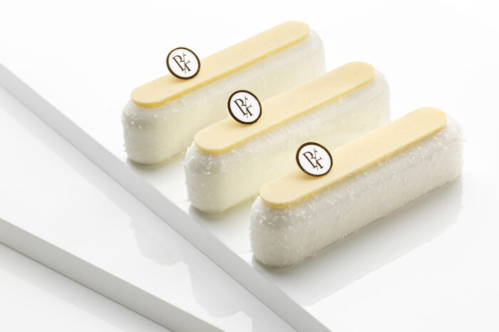 Croustillant coco, biscuit moelleux amande, crémeux passion, crème légère vanille.