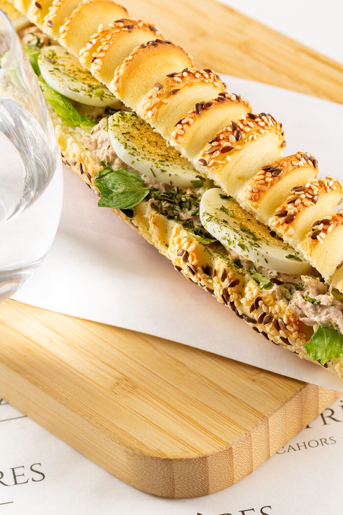 Baguette Viennoise Lin – Sésame , laitue , thon à la mayonnaise , oeuf dur , ciboulette
