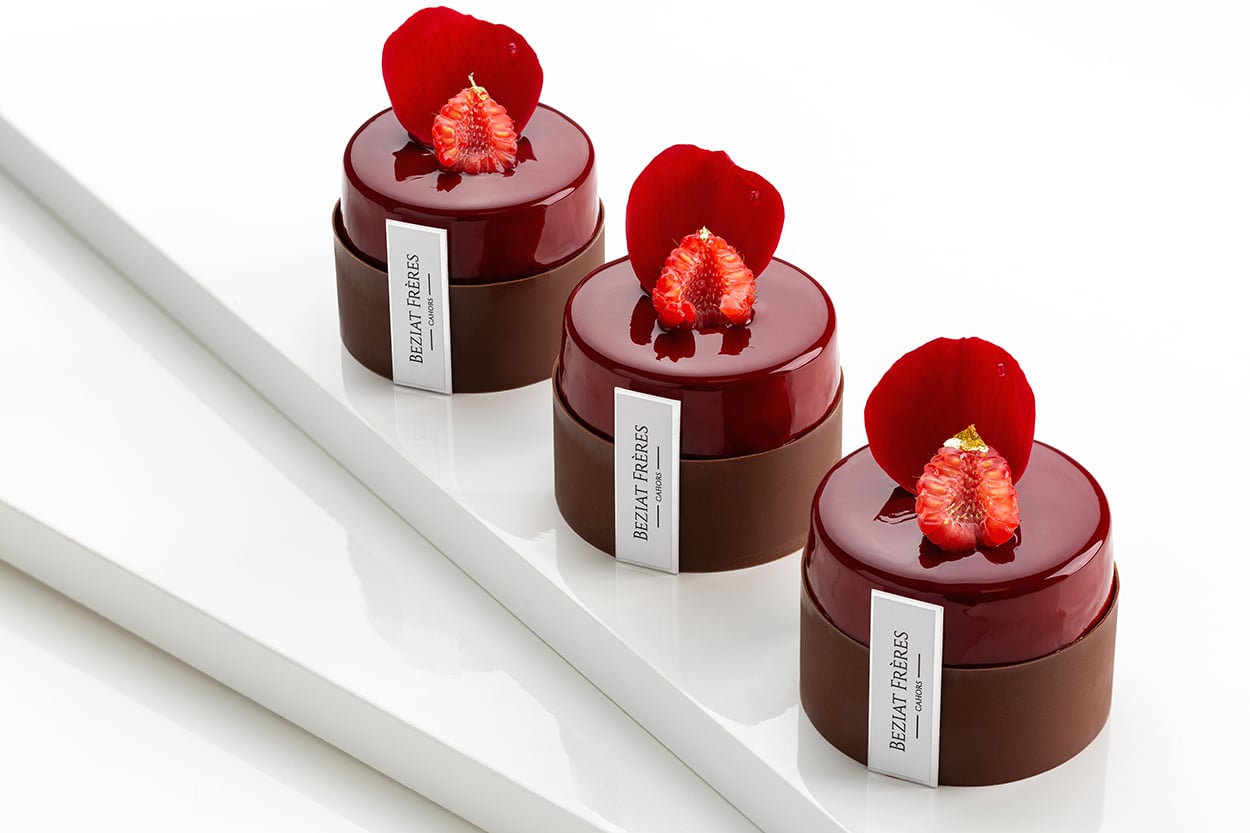 Croustillant chocolat , biscuit moelleux chocolat , compotée de framboises , mousse chocolat 65%